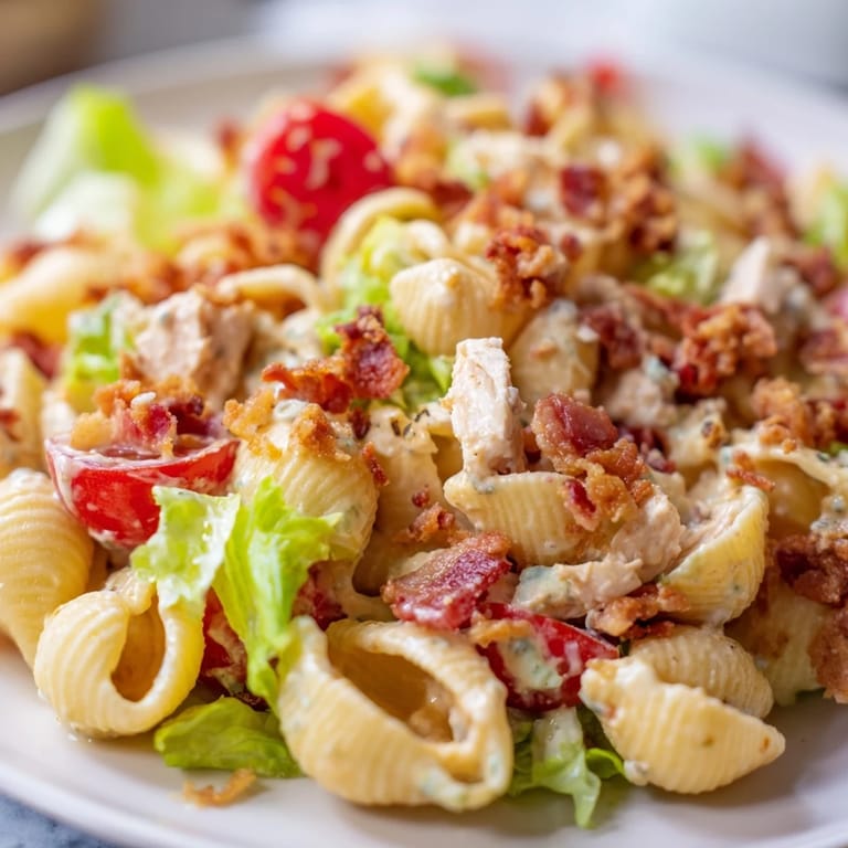 Save Bring the classic flavors of a beloved sandwich to your table with this BLT Chicken Pasta Salad. This dish combines the smokiness of crispy bacon with the freshness of juicy cherry tomatoes and crisp romaine lettuce, all anchored by tender pasta shells and lean grilled chicken. It is a fresh and hearty combination that works perfectly for any occasion.