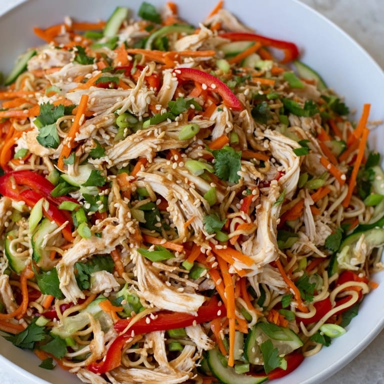 Save There's something about a bowl of chilled noodles that catches you off guard on a sweltering afternoon—suddenly you're not forcing yourself to eat, you're actually hungry. I discovered this salad by accident, really, when I had leftover shredded chicken, a half-empty vegetable drawer, and the kind of heat that made cooking anything warm feel like betrayal. The sesame dressing came together in minutes, and what emerged was bright, alive, and exactly what the moment needed. It's become my answer to those days when you want something substantial but won't heat up the kitchen.