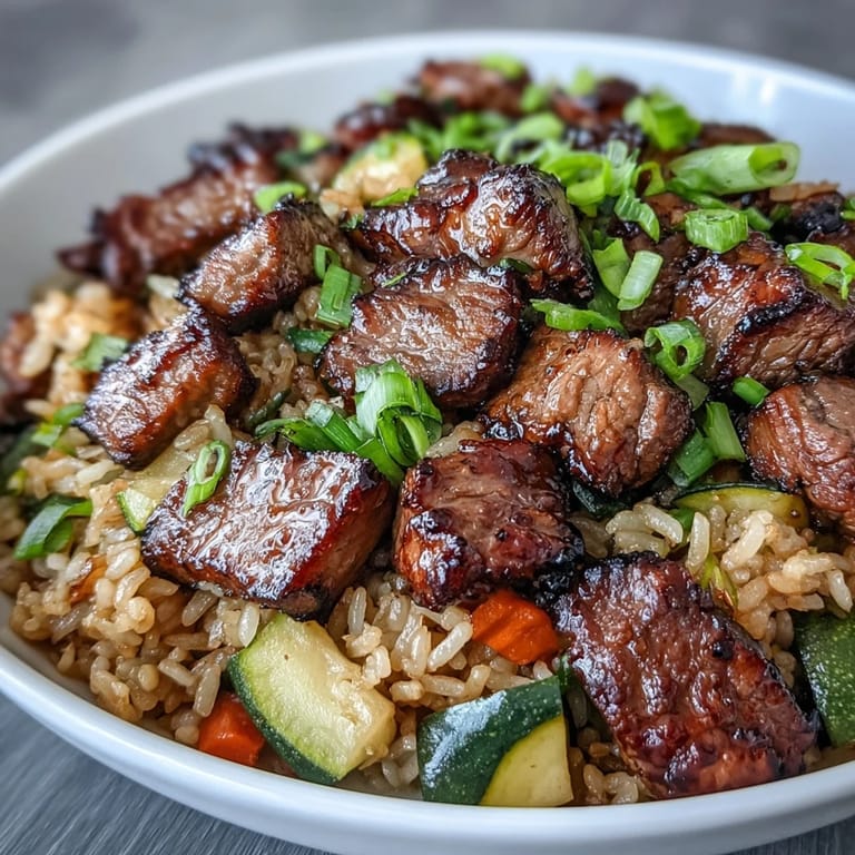 Save Bring the excitement of a Japanese steakhouse right to your kitchen with this Easy Hibachi Steak With Fried Rice. It's a quick and flavorful one-pan meal that combines tender, marinated sirloin with vibrant vegetables and perfectly seasoned rice. Whether you're short on time or just craving those classic hibachi flavors, this dish delivers a satisfying experience with minimal cleanup, making it the perfect choice for a busy weeknight.