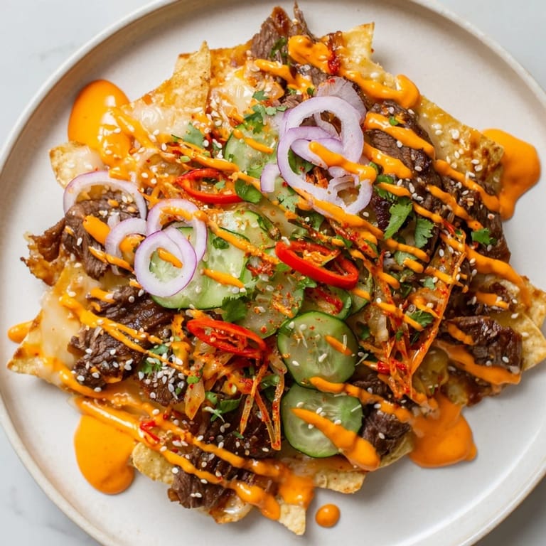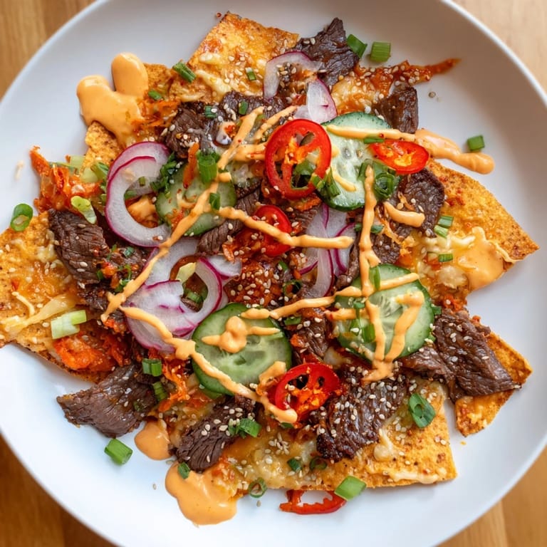 Korean BBQ and nachos seem like they shouldn't work together, but they do because both are fundamentally about bold, layered flavors and textural contrast. The spicy, umami-forward beef plays beautifully against melted cheese, and the fresh vegetables add brightness that keeps everything from becoming heavy. This dish respects both cuisines while creating something entirely its own, which is the heart of fusion cooking done right.
