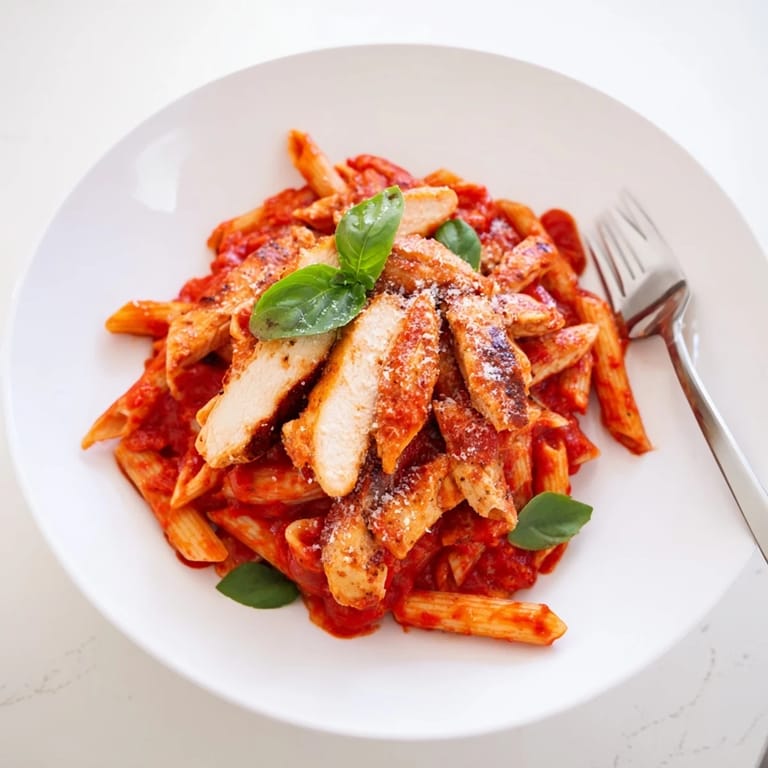 - Toss the drained penne into the sauce, stirring until every piece is coated. Top with the sliced chicken, sprinkle with fresh basil and Parmesan, and serve hot.