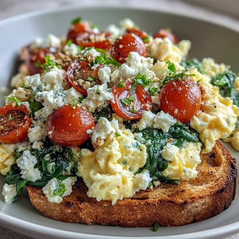 - Divide the scrambled eggs between two bowls, then top each one with a handful of wilted spinach, the halved tomatoes, and a generous scatter of crumbled feta. The warm eggs will soften the cheese slightly while keeping it creamy.